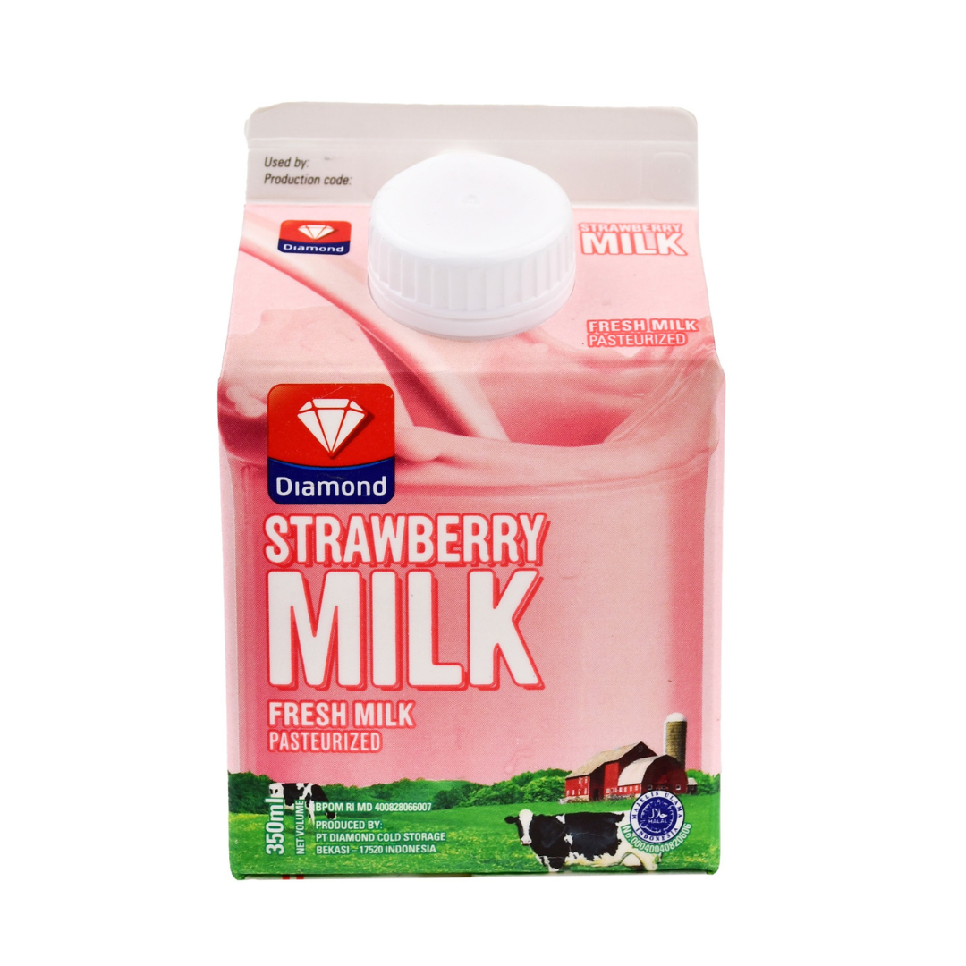 Diamond Fresh Milk Strawberry 350ml adalah susu segar yang dipasteurisasi dengan rasa stroberi.