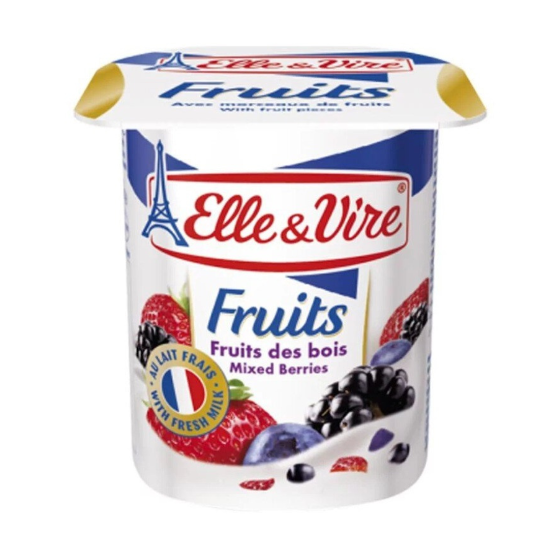 Elle & Vire Fruits Yoghurt Mixed Berry: Yoghurt susu fermentasi dengan campuran potongan buah blackberry, stroberi, dan blueberry