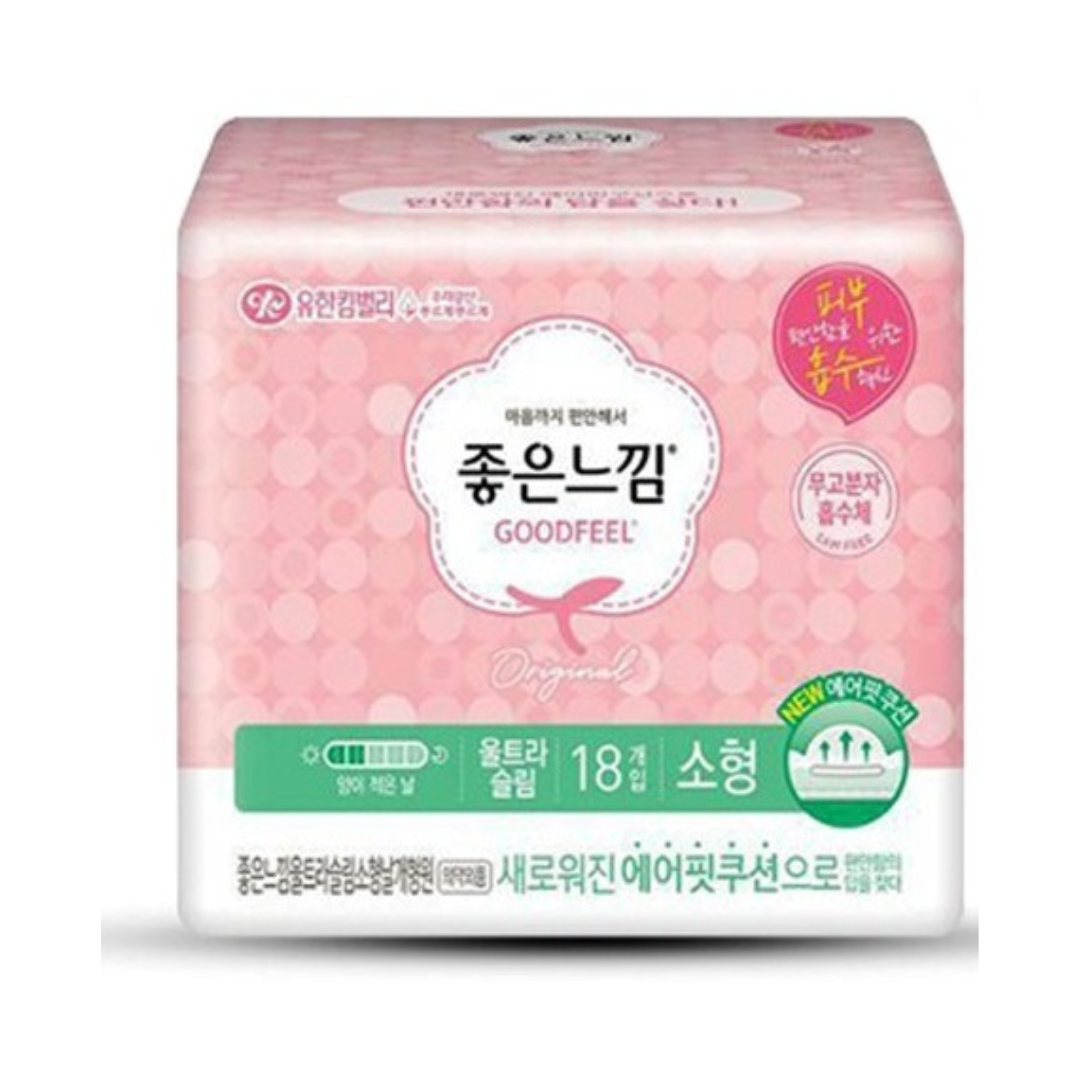 GOODFEEL Ultraslim Small Wing One 18 Pads adalah pembalut wanita asal Korea yang dirancang untuk kenyamanan maksimal dengan desain ultra tipis dan sayap kecil, cocok digunakan saat siang hari.