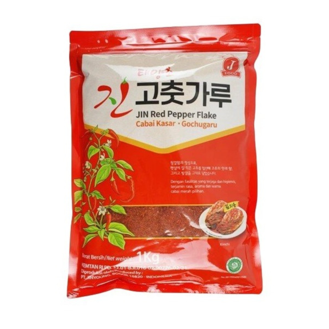 Bubuk cabai kasar JIN Red Pepper Flake (Gochugaru) dalam kemasan 1 kg adalah bumbu khas Korea yang sering digunakan untuk membuat kimchi dan berbagai masakan lainnya.