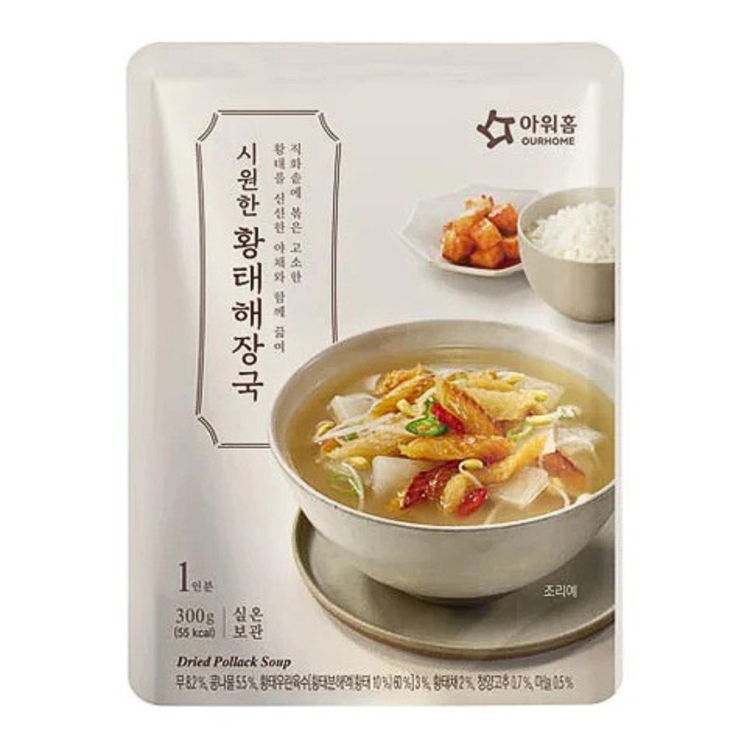 OURHOME Frozen Dried Pollack Soup 300g adalah sup siap saji khas Korea yang menggunakan ikan kod kering (hwangtae) sebagai bahan utama, dikemas dalam pouch praktis dan cocok sebagai hidangan hangat bergizi.