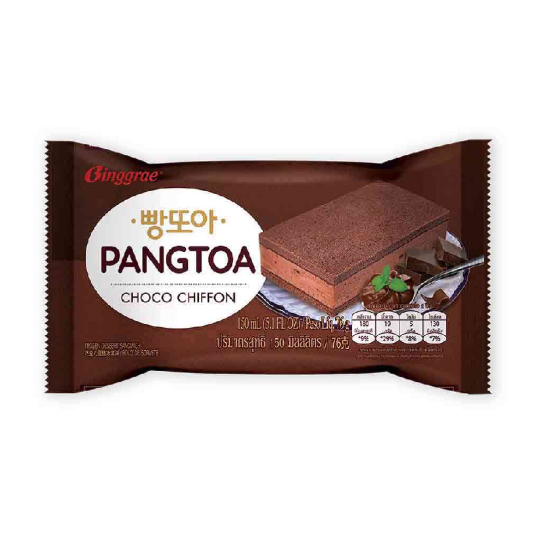 Es krim Binggrae Pangtoa Choco Chiffon 150ml adalah es krim sandwich asal Korea yang populer. Es krim ini memiliki isian krim cokelat lembut yang dibalut dengan roti chiffon cokelat yang halus dan empuk, menghasilkan perpaduan rasa dan tekstur yang unik.