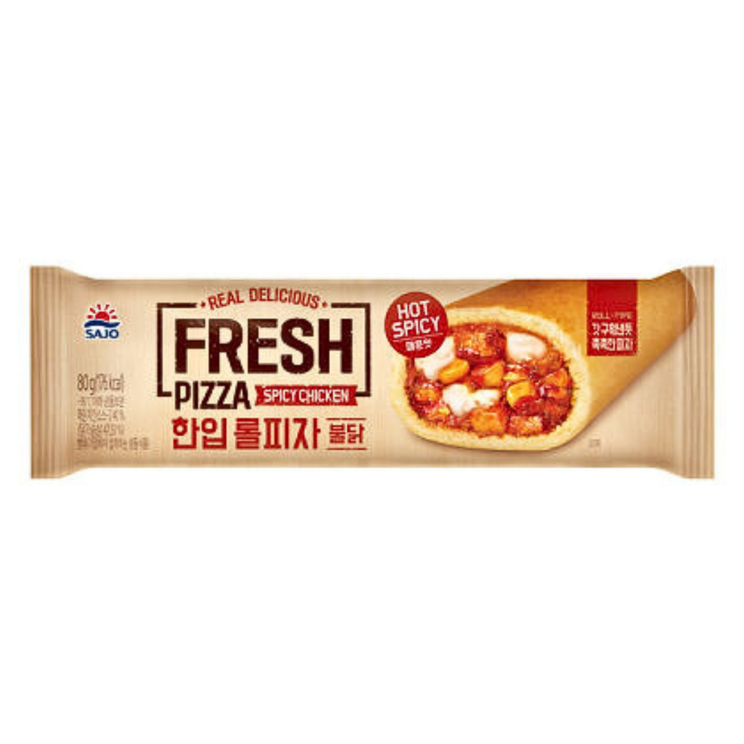 ROLL PIZZA (Hot Spicy Chicken) 80g adalah makanan beku instan asal Korea berupa roti gulung berisi ayam pedas dan keju, siap santap setelah dipanaskan. Cocok sebagai camilan cepat atau isi lunch box
