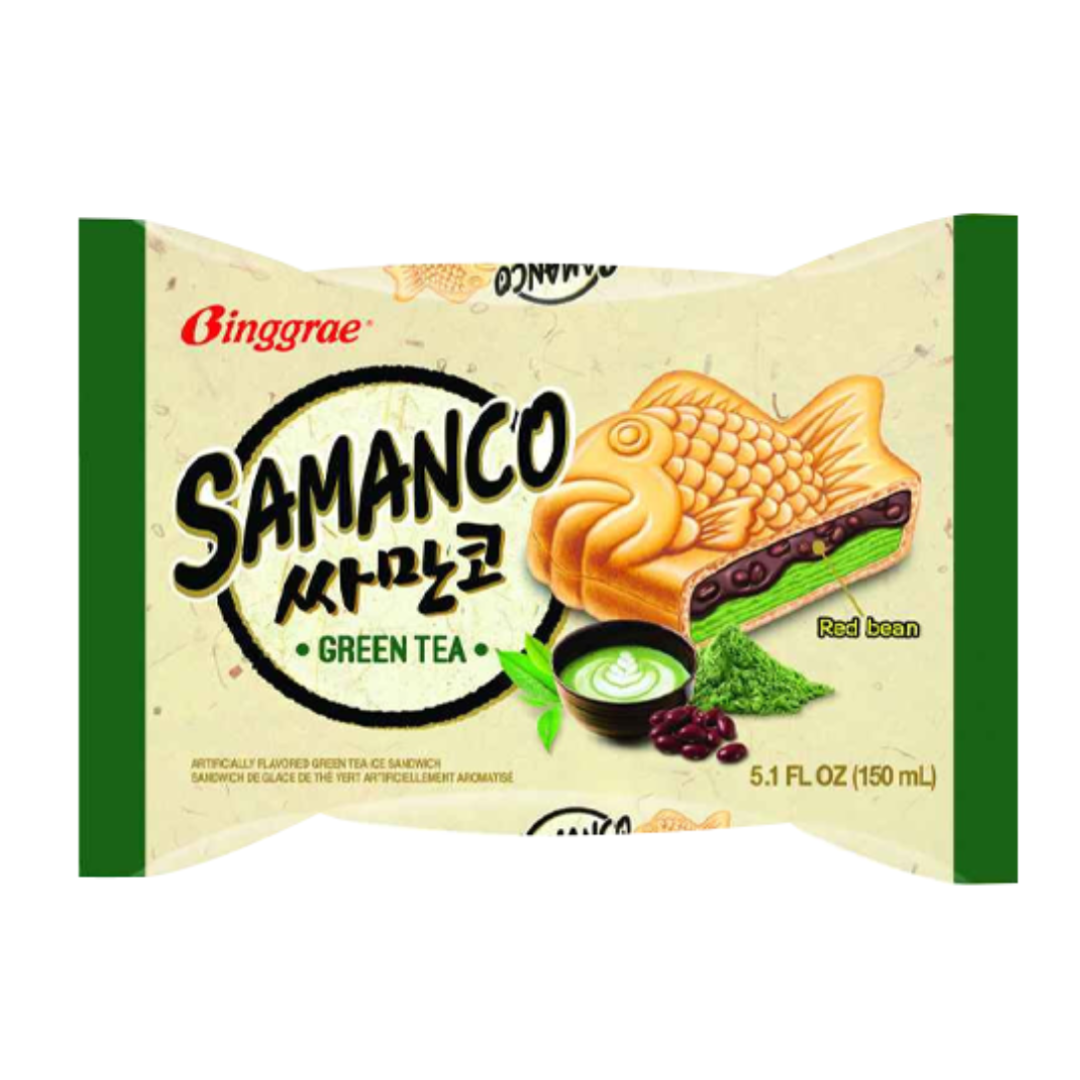 Es krim Binggrae Samanco Green Tea Dessert Sandwich 150ml. Es krim ini berbentuk sandwich yang unik dengan es krim rasa teh hijau di dalamnya, yang dibalut oleh kue wafel berbentuk ikan. perpaduan lezat antara es krim rasa teh hijau yang lembut dengan kue wafel yang renyah