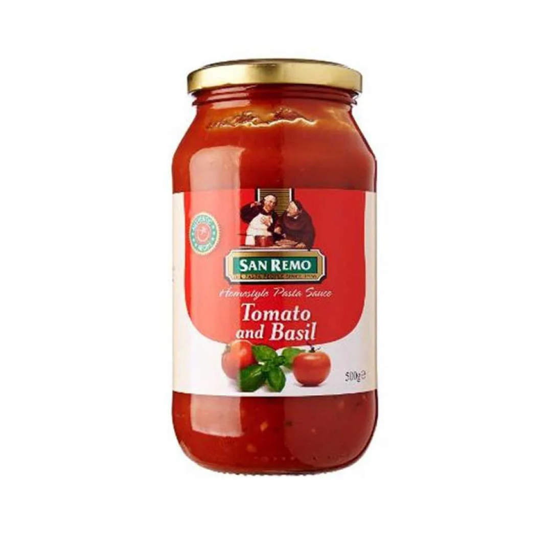 San Remo Pasta Sauce Tomato & Basil 500g adalah saus pasta bergaya rumahan yang menggabungkan tomat matang dan daun basil segar, cocok untuk berbagai jenis pasta.